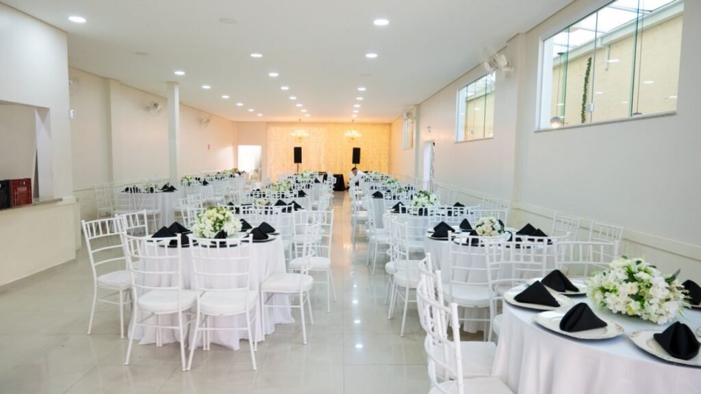 Salão climatizado, iluminação cênica e layout flexível para casamentos, debutantes, aniversários e eventos corporativos.